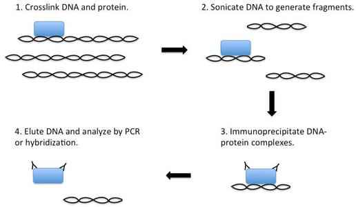 染色質(zhì)免疫沉淀技術(shù)(Chromatin immunoprecipitation assay, ChIP)是研究體內(nèi)環(huán)境下DNA與蛋白質(zhì)互作的方法,常用于體內(nèi)轉(zhuǎn)錄因子結(jié)合位點等方面的研究。其基本原理是在活細(xì)胞狀態(tài)下固定蛋白質(zhì)-DNA復(fù)合物,并將其隨機(jī)切斷為一定長度范圍內(nèi)的染色質(zhì)小片段,然后通過免疫學(xué)方法沉淀此復(fù)合體,特異性地富集目的蛋白質(zhì)結(jié)合的DNA片段,通過對目的片斷的純化與檢測,從而獲得蛋白質(zhì)與DNA相互作用的信息。